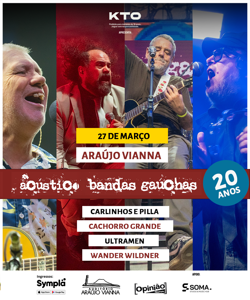 Com os ingressos esgotados em tempo recorde para as suas primeiras duas sessões, o espetáculo que comemora os 20 anos do icônico “Acústico MTV Bandas Gaúchas” vai ganhar uma nova edição, no dia 27 de março de 2026. O show, que reúne Carlinhos Carneiro e Rodrigo Pilla, Cachorro Grande, Ultramen e Wander Wildner, ocorerrá mais uma vez no Auditório Araújo Vianna.