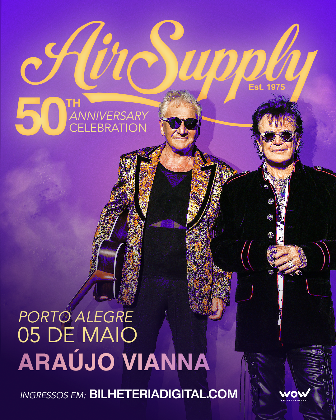 O Air Supply vai se apresentar em Porto Alegre (Auditório Araújo Vianna) no dia 5 de maio de 2026, com ingressos vendidos pela Bilheteria Digital.