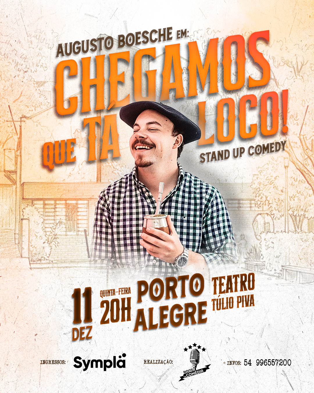 Agora, Augusto Boesche dá um passo importante em sua trajetória: a estreia nos palcos com o espetáculo de stand up comedy “Chegamo que tá loco”, uma extensão natural de seu sucesso nas redes. No show, ele leva ao público as situações mais inusitadas da vida real com seu olhar irreverente e o sotaque marcante que virou sua marca registrada.