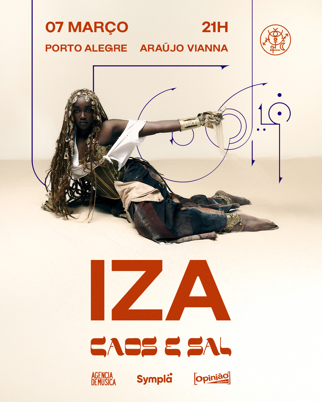 IZA se apresenta em Porto Alegre, dia 7 de março, com o show “Caos e Sal”, que reúne os seus maiores sucessos, versões de músicas que inspiraram a artista. A apresentação, que ocorre no Auditório Araújo Vianna, ainda inclui os seus dois lançamentos recentes, “Caos e Sal” e “Tão Bonito”.