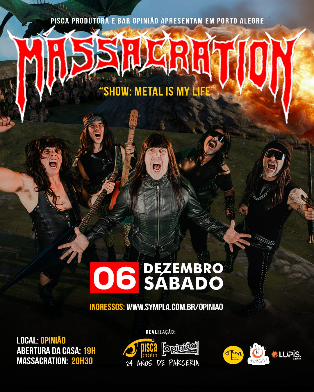 O Massacration, formado pelos integrantes do humorístico “Hermes e Renato”, vai retornar a Porto Alegre. A banda, que lançou há pouco o álbum “Metal is My Life”, estará novamente no palco do Opinião, no dia 6 de dezembro.