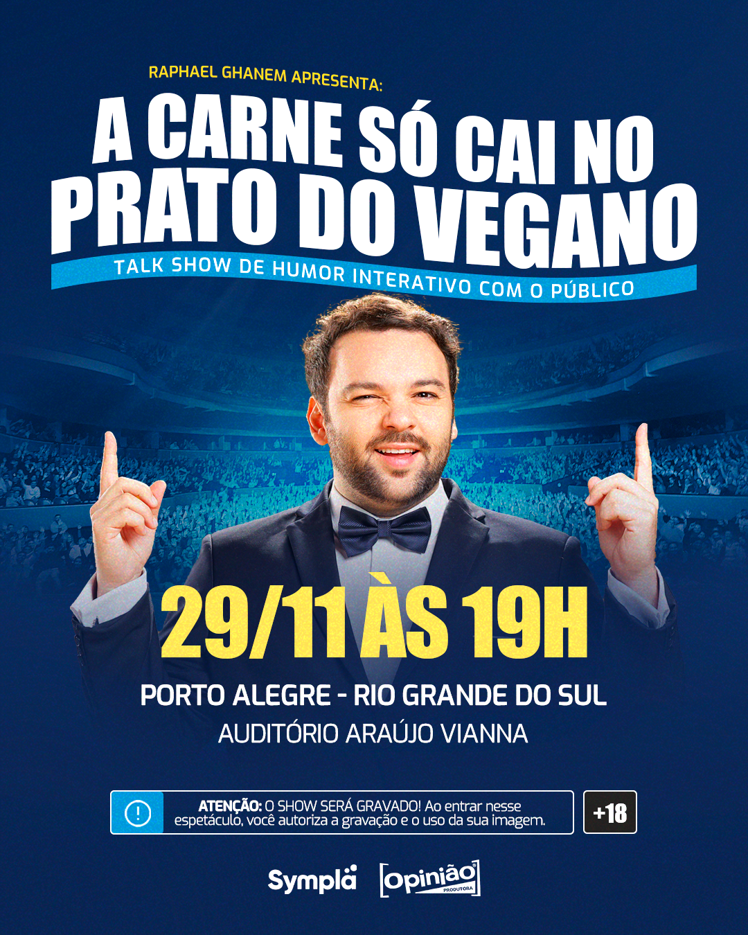 Um dos maiores fenômenos do humor no Brasil, o carioca Raphael Ghanem vai retornar a Porto Alegre. O ator e comediante, que coleciona milhões de seguidores nas redes sociais e vídeos que viralizaram em todas as plataformas, subirá ao palco do Auditório Araújo Vianna, no dia 29 de novembro, com o seu mais novo show solo, chamado “A Carne Só Cai no Prato do Vegano”.